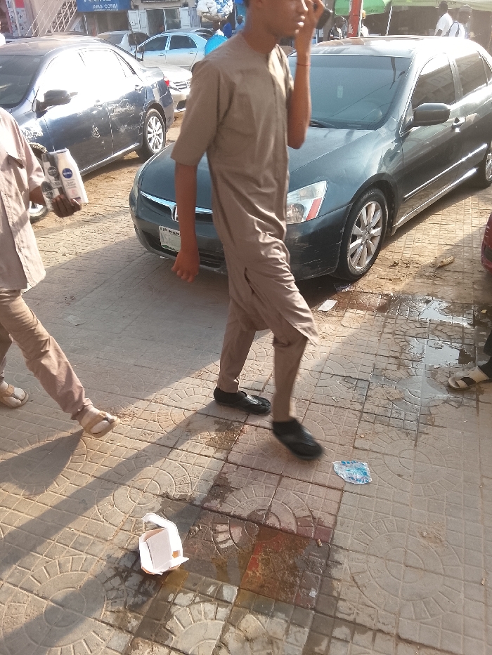Two men in matching brown, traditional clothing walk along a tiled sidewalk in front of cars. One man carries two bottles of Nivea lotion. A gray sedan sits parked on the right, and a navy-blue sedan is parked to the left of that. There is some litter on the sidewalk. One piece of litter is a small, crumpled, white cardboard container. A piece of clear plastic packaging sits on the sidewalk near the brown-clad man’s right foot.