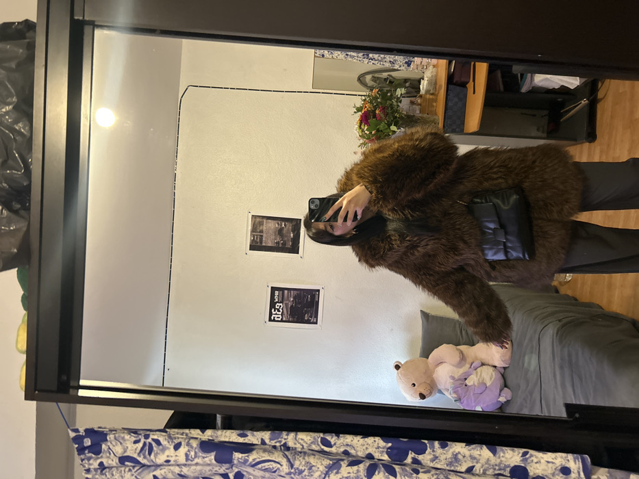 The image depicts a mirror selfie taken by a person in a room located in Strasbourg, France. A person with dark hair, visible from approximately the neck down, stands facing a large dark-framed mirror. They are wearing a shaggy, voluminous dark brown faux fur coat and dark-colored trousers. A black quilted shoulder bag with a black strap is slung across their body. The person holds a black smartphone, featuring a dual-camera lens, to capture their reflection. The dark brown frame of the mirror, likely part of a wardrobe door, has several items on its top edge, including yellow objects, green objects, and a black plastic bag. The reflected room's interior features a white wall with two dark posters affixed; one displays partial text "dES" and "WHAT". A thin black strip, possibly an LED light strip, outlines the top and right side of the reflected wall. A bright, circular light source is reflected in the upper central portion of the mirror. To the reflected left, a bed with a dark grey duvet and pillow hosts a large, light brown teddy bear holding a smaller purple stuffed animal. To the reflected right, a wooden desk or shelf supports a clear vase with a multicolored floral arrangement, a patterned box, and other small personal items. Blue and white floral-patterned curtains are partially visible on the far left of the image, adjacent to the mirror frame.