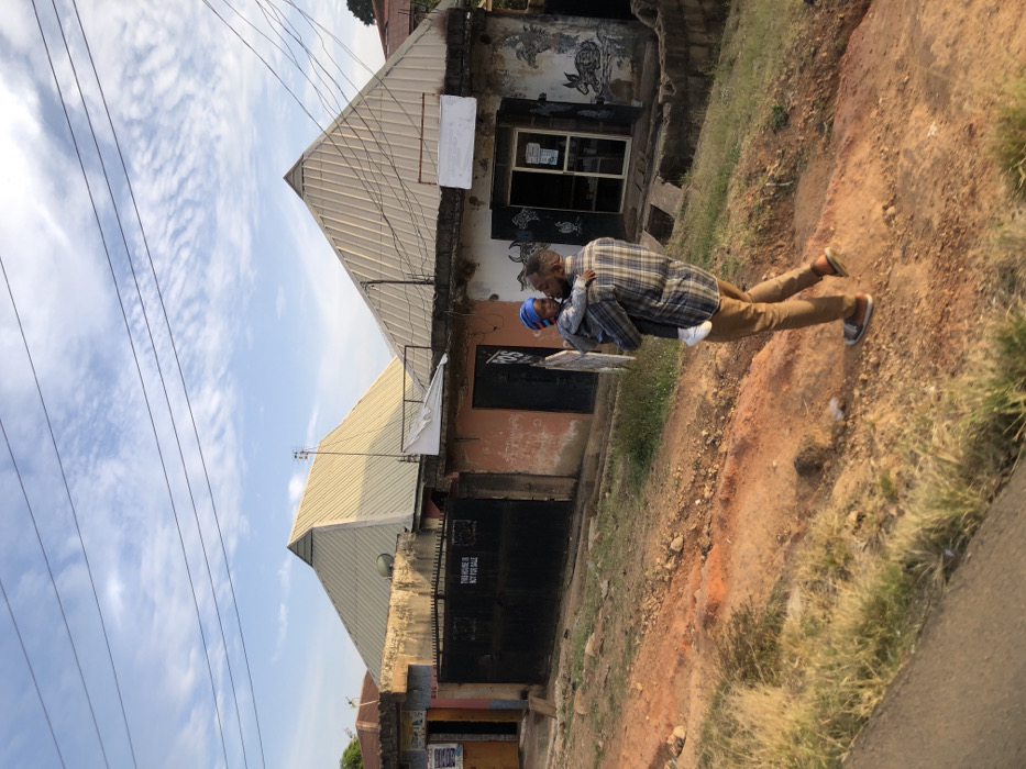 The scene depicts Rukuba Road, Nigeria. An adult male, bearded and wearing a blue plaid shirt, khaki trousers, and sandals, carries a young child in a blue beanie, grey hooded sweatshirt, and white sneakers. Both individuals are on an unpaved reddish-brown dirt path. The child faces and appears to look at the man. In the midground, a series of single-story structures with corrugated metal roofs are visible. The central structure features a dark metal gate displaying a white sign with black text: "THIS HOUSE IS NOT FOR SALE". Adjacent to it, a building with weathered orange paint displays a "POS" sign, while another exhibits peeling white paint and dark murals, including one of a rabbit, with a glass entrance. Two buildings with light-colored, pyramidal corrugated metal roofs rise behind these structures. Overhead, multiple black electrical wires are visible against a partly cloudy blue sky. Sparse green and dry grass flanks the dirt path in the foreground.