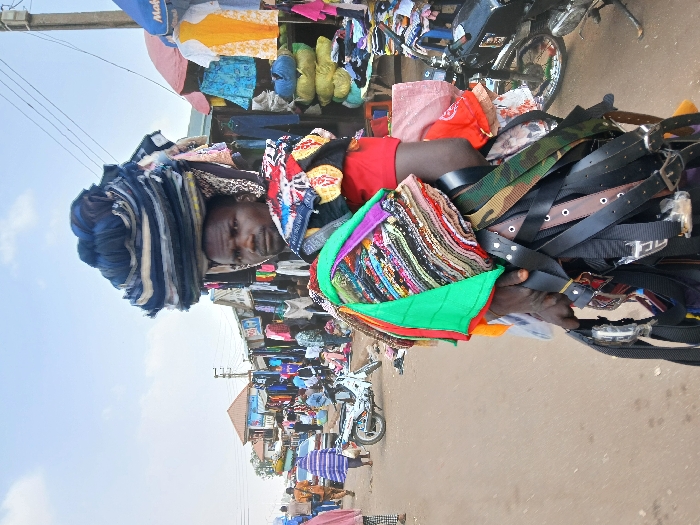 The image displays a male street vendor in an unpaved market street in Heany, Zimbabwe. The vendor, wearing a red shirt, is centrally positioned, balancing a large stack of dark, folded fabric on his head. He carries multiple stacks of brightly colored, folded textiles draped over his left shoulder and arm, and holds a collection of belts, including black and camouflage patterns, in his left hand. His gaze is directed slightly left of the camera. In the background, numerous individuals are present within an active market setting. Open-air stalls line the street, displaying various clothing items on racks, tables, and in stacks. Two motorbikes are visible in the midground. Buildings with corrugated metal and tiled roofs are present, along with utility poles and overhead wiring, under a partly cloudy sky.
