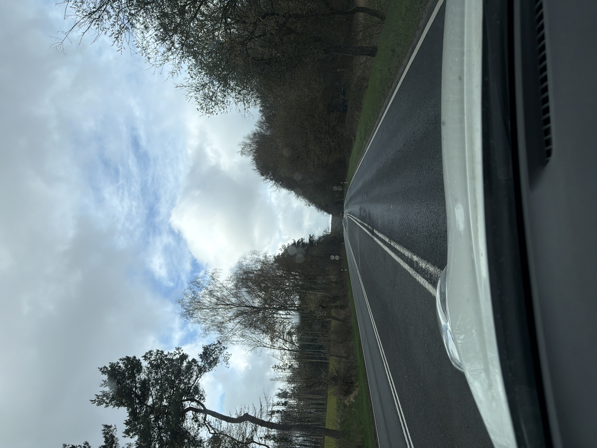 A forensic examination of the image reveals a forward-facing perspective from inside a vehicle, with the white hood and dark dashboard visible in the lower frame, suggesting travel on a two-lane asphalt road. The road surface appears wet or damp. The road extends into the distance, curving slightly to the right, and is marked by double solid white lines centrally and single white lines on the outer edges. On the left side of the road, a narrow green verge leads to a mixed forest composed predominantly of bare deciduous trees, with some evergreen trees visible further back. A patch of green field is discernible behind the initial line of trees. Several trees exhibit bare branches, indicating late autumn, winter, or early spring. Two circular white road signs are present on the left verge. On the right side of the road, a similar green verge abuts a dense line of bare deciduous trees. A dark-colored vehicle is partially obscured amongst the foliage on the right side of the road further down. Two circular white road signs are also visible on the right verge. The sky is largely overcast with grey and white clouds, but patches of blue sky are visible in the upper center. The scene is illuminated by daylight. No individuals are present. The location is identified as Niederanven, Luxembourg.
