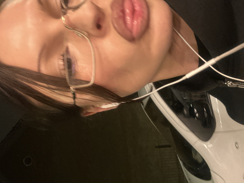 A close-up image depicts an individual from the chest up, positioned outdoors in low light conditions. The person has dark hair with lighter streaks, wears light-framed glasses, and has white wired earphones inserted into both ears, with the wire visible down the front. Their right eye (viewer's left) is partially visible, directed downwards. The individual's lips are formed into a prominent, glossy pouting gesture. They are wearing a black garment, consistent with a hoodie or jacket, featuring a visible zipper pull on the right side. In the out-of-focus background, partially visible to the left, is the side profile of a white car, potentially a compact model, and a dark, slender vertical object. The specific location within the city of London, United Kingdom, cannot be determined from the visual information contained within the image.