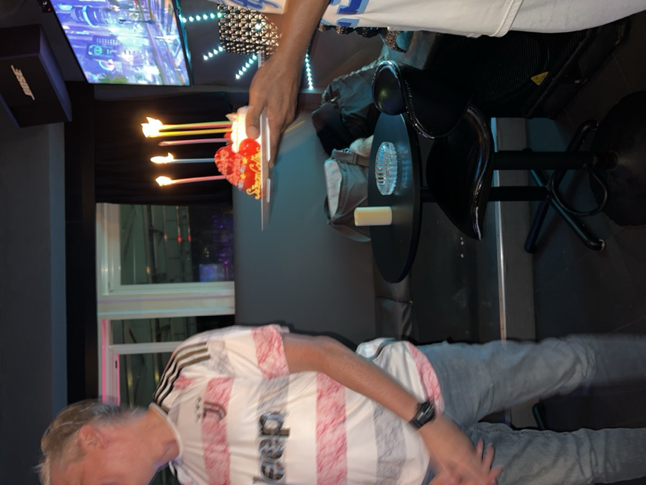 This indoor image depicts a celebratory moment within what appears to be a commercial establishment, such as a lounge or bar, located in Minato, Japan. The specific address or venue name is not discernible from the visual information. On the left, a partially visible Caucasian male, cropped at the top of his head and waist, exhibits an open-mouthed expression consistent with laughter or vocalization. He is wearing a white short-sleeved football jersey featuring black shoulder stripes, red and white horizontal body stripes, and a "JEEP" logo. A black wristwatch is visible on his left wrist, and motion blur suggests recent movement. On the right, the right arm and hand of a second individual, wearing a white shirt with blue patterns, are visible as they present a small, round white cake on a white plate. The cake is adorned with red frosting or fruit, yellow decorative elements, and five lit candles of various colors, including pink, yellow, blue, and red. In the mid-ground, a small, round black table holds a tall, unlit cylindrical off-white candle and a clear glass ashtray. A black, high-backed bar stool is positioned next to the table. In the background, a dark upholstered bench runs along the wall. Overhead on the right, a black BOSE speaker is mounted. Below it, a large flat-panel television displays a vibrant, futuristic cityscape illuminated with neon lights. Adjacent to the TV, a dark wall panel features radiating LED strip lights. In the left background, a large window or glass partition offers a view into another dimly lit interior space. The scene is illuminated by artificial light sources, including the cake candles and display screens, suggesting an evening or night setting.