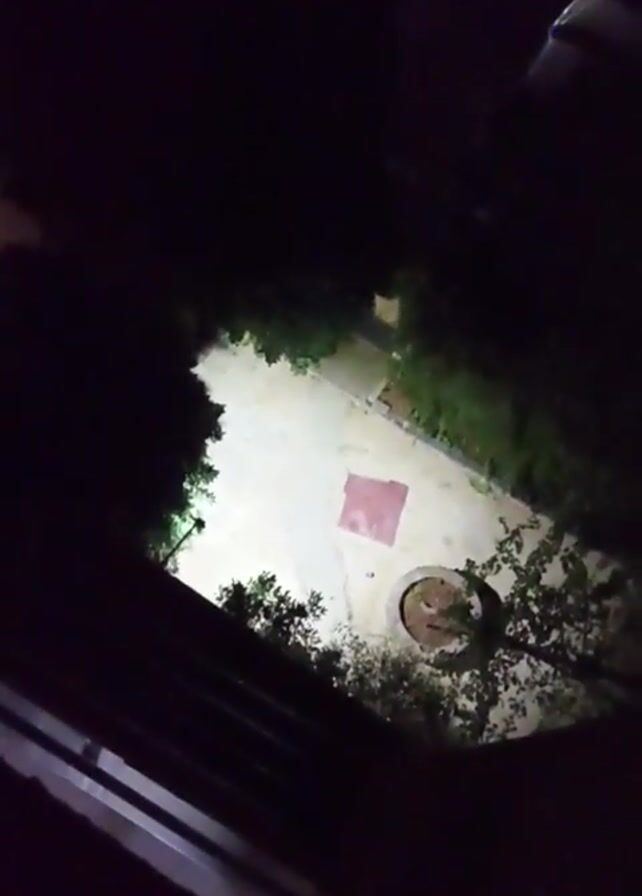 The scene shows an outdoor area at night, illuminated by a street light. The view is from above, likely from a window. There's a paved area with a square, red patch. A circular planter with some greenery sits to the right. The area is surrounded by shrubs and trees. The camera is relatively still, but there's slight movement.