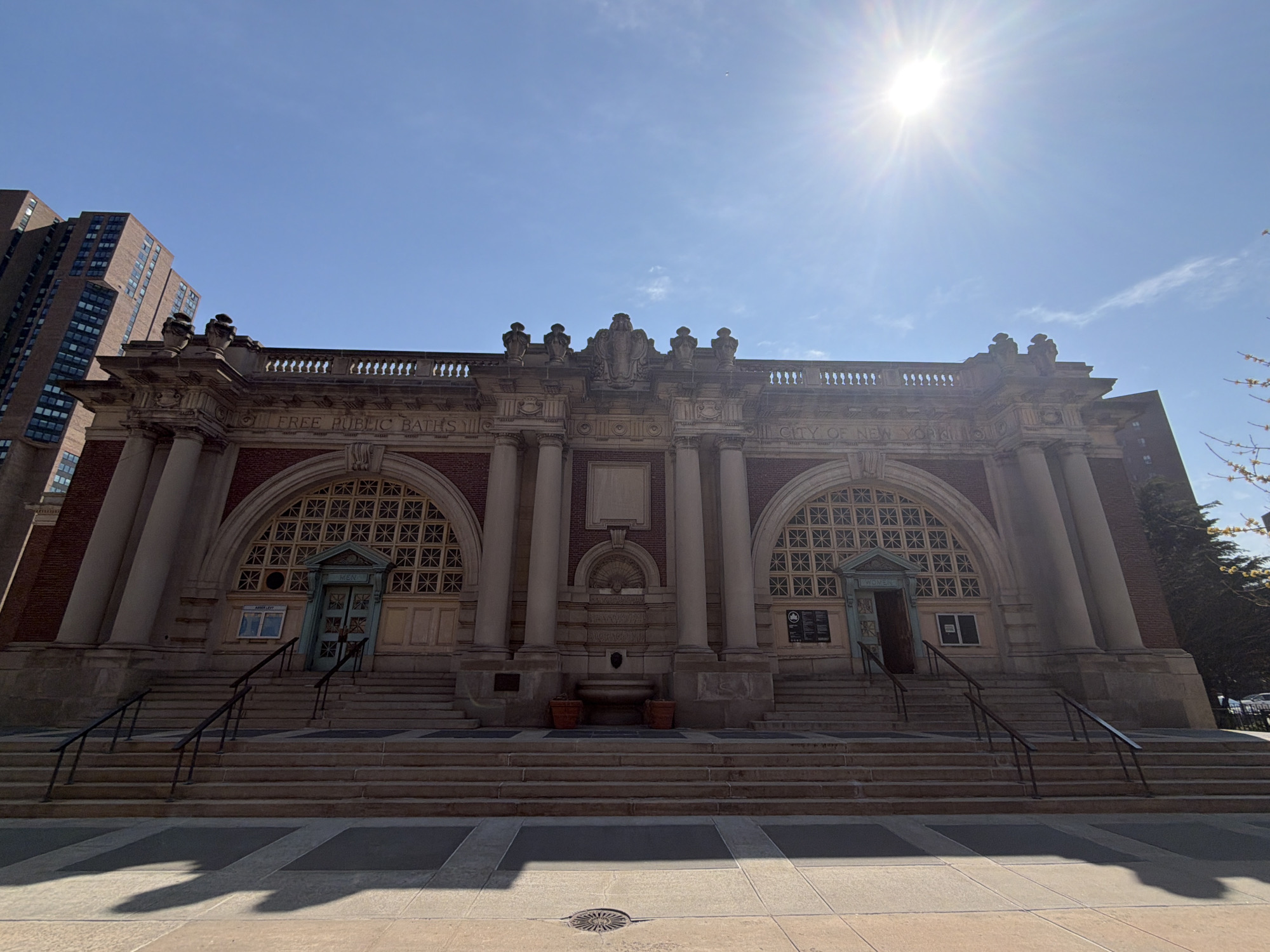 The image depicts the Asser Levy Public Baths (now Asser Levy Recreation Center) located at Asser Levy Place, between East 23rd and East 24th Streets, in the Kips Bay neighborhood of Manhattan, New York City, United States of America. The scene presents the facade of a classical revival style brick and stone building under a clear blue sky with minimal cloud cover and a bright, radiant sun positioned in the upper right. The building features two large arched window bays with intricate patterned grilles, flanked by fluted columns. Above the archways, the inscription "FREE PUBLIC BATHS" is visible on the left, and "CITY OF NEW YORK" on the right. A prominent central decorative element with a carved crest and balustrade is situated above a niche containing a lion-head spigot and two terracotta planters. Two sets of stone steps with black metal handrails lead up to two entrance doors, one marked "MEN" on the left and "WOMEN" on the right. Information boards are affixed to the wall next to each entrance. In the background to the left, a tall, multi-story residential building with numerous windows is partially visible. The foreground shows a paved sidewalk with geometric patterns and a circular metal manhole cover centered in the lower portion of the frame. Strong shadows from the building and handrails are cast forward onto the sidewalk. No people or vehicles are visible in the immediate vicinity.