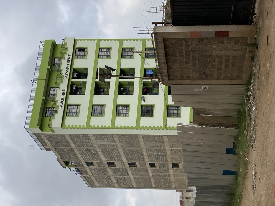 A tall, rectangular apartment building dominates the frame. It has a green and white color scheme on the top floors, featuring multiple windows. The name "FAVOURED APARTMENT" is visible on the side. The lower floors are a grey concrete structure with smaller windows. A roughly constructed structure with grey blocks and corrugated metal sheets stands to the right. Above, the sky is cloudy and overcast. The ground shows signs of dirt and sparse vegetation.