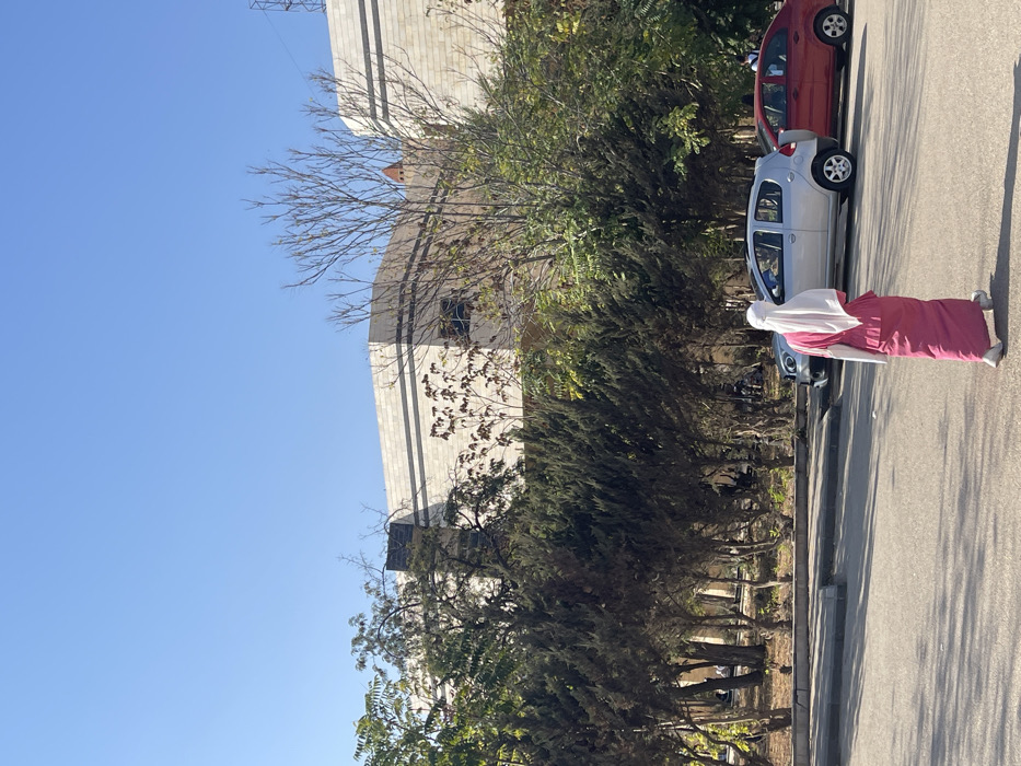 A woman in a pink dress and white headscarf stands on a street beside parked cars. Lush green trees line the road, contrasting with the adjacent building constructed from light-colored blocks. A clear blue sky fills the top left corner of the frame. The scene is bathed in bright sunlight, casting shadows on the road and the building.
