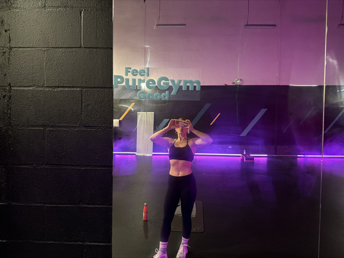 A woman in black leggings and a sports bra takes a mirror selfie in a PureGym