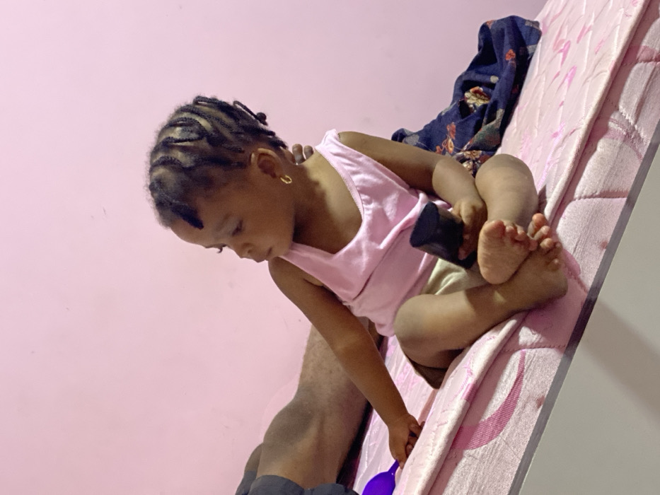 A child with braided hair and an earring sits on a bed, wearing a pink tank top. They hold a black object in their hands. Part of an adult's leg is visible, as well as a blue-patterned fabric item. The bed has a pink quilted cover. The background features a plain pink wall. The lighting is soft, casting gentle shadows.