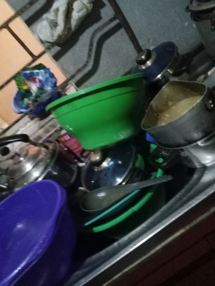 The image displays a cluttered kitchen sink area within an indoor setting, location Unknown, Unknown. The scene is dimly lit. A stainless steel sink basin occupies the lower half of the frame, filled with various unwashed kitchen items. In the central foreground, a large, bright green plastic bowl is prominently positioned. To its right, a dark metal pot contains a quantity of light-colored, semi-solid residue. Above this pot, a blue pot lid with a metallic, possibly brass-colored, knob is visible. To the left of the green bowl, a stainless steel pot with a black handle and a clear glass lid is present. A purple plastic bowl is partially visible in the lower left corner. Resting on a stack of green plastic plates within the sink is a dark-colored spoon or ladle. In the upper left background, terracotta-colored wall tiles are discernible, alongside a blue bowl containing a crumpled, multi-colored plastic bag. A dark metal grid or rack structure is also visible in the background. No individuals are present in the scene.