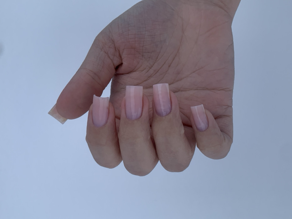 A close-up photograph depicts a human left hand against a uniform, plain light blue-grey background. The hand is positioned with fingers slightly curved and spread, displaying the palm's natural creases and knuckle wrinkles. Five fingernails are visible, from thumb to pinky. All nails are long, appear to be artificial enhancements (likely acrylic or gel), and are shaped in a square or coffin style. They feature a translucent pale pink or nude color, with a subtle ombré transition where the tips are clearer or lighter. A minor chip or irregularity is visible on the outer corner of the thumb nail's tip. The background lacks any discernible features, landmarks, or environmental context that would identify a specific geographic location such as the city of Фоки, Russia. No actions or interactions beyond the hand's pose are depicted.