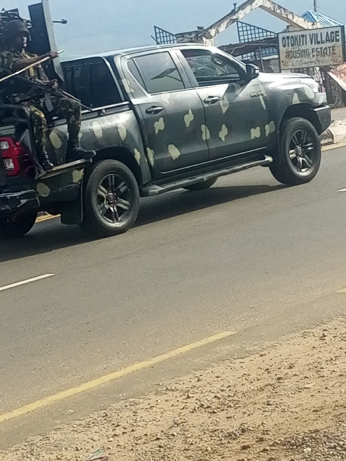 The image displays a security scene on a paved road within the city of Adankolo, Nigeria, near a sign identifying "OTOKITI VILLAGE HOUSING ESTATE." A dark-colored four-door pickup truck, consistent with a Toyota Hilux model, is centrally positioned on the asphalt road, showing a distinctive mottled green and grey camouflage paint scheme. The truck is equipped with black multi-spoke wheels and a running board. One individual, dressed in a full camouflage uniform, dark helmet, and dark boots, is seated on the left side of the truck's bed. The person holds a dark-colored long firearm, likely an assault rifle, in the left hand, oriented downwards, and a light-colored stick or rod in the right hand, extending upwards. A red container, possibly a jerrycan, is partially visible behind the individual within the truck bed. The road surface includes a solid yellow line marking the right edge of the lane, adjacent to a gravelly, sandy shoulder. In the background, behind the pickup truck, a white sign with blue lettering spelling "OTOKITI VILLAGE HOUSING ESTATE" is mounted on a decorative archway structure. The sky above is light, possibly overcast.