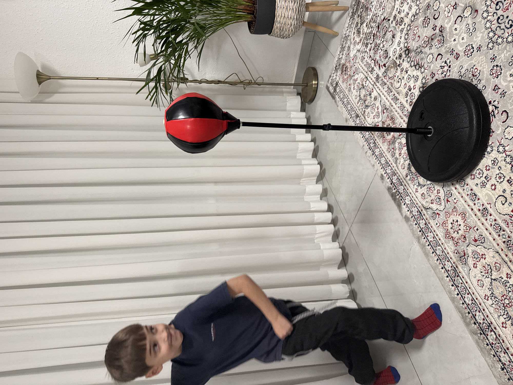 An indoor scene in Netanya, Israel, depicts a young male child, approximately 7-10 years old, in dynamic motion near a freestanding punching bag. The child has short brown hair and is wearing a dark blue t-shirt, black sweatpants with white side stripes, and red socks with blue accents. He is positioned towards the left of the frame, looking right with a slight smile, his left arm bent and torso angled. A red and black punching bag, mounted on an adjustable black pole with a circular black base, stands centrally in the foreground on a light-colored rug. The rug features intricate red, blue, and black floral and medallion patterns. To the right of the punching bag, a brass-toned floor lamp with an upward-facing white shade is visible. Further to the right, a potted green plant is housed in a dark grey pot, which rests on a three-legged wicker-style plant stand. The floor is covered with light grey square tiles. The background consists of floor-to-ceiling white pleated curtains on the left and a white textured wall on the right. The child appears to be actively engaging with or moving around the punching bag.