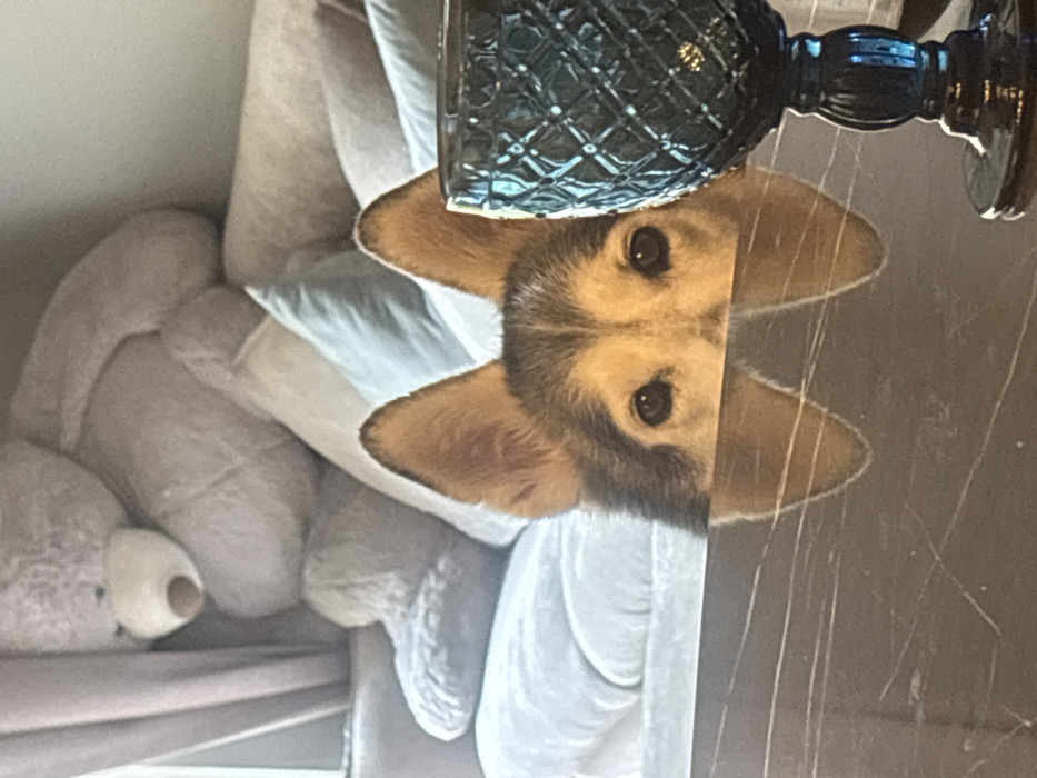 The image captures an indoor scene in Naucalpan de Juárez, Mexico. A domestic canid, exhibiting tan and dark brown fur, is positioned centrally, with only its eyes and erect ears visible above a dark, reflective table surface. A distorted reflection of the animal's head and ears is visible on the table, which displays multiple linear abrasions. To the right, a dark blue or black glass goblet with a distinct diamond-patterned texture rests on the table. The background features a light-colored sofa or couch adorned with several cushions in various light tones, including beige and pale blue. A large, light gray teddy bear is seated on the sofa, partially obscured by light-colored curtains on the left side of the frame.
