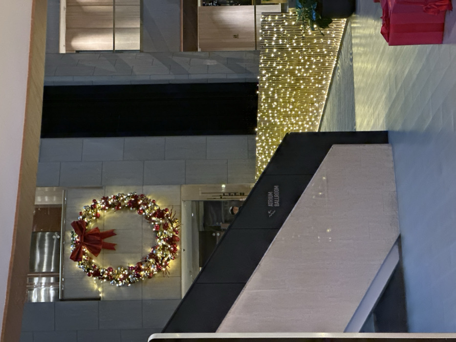 The image depicts the interior of the InterContinental Singapore hotel, located at 80 Middle Road, Singapore, 188966. The scene is a multi-level atrium, decorated for the holiday season. A large circular Christmas wreath, approximately 2 meters in diameter, is mounted centrally on a light grey tiled wall in the mid-ground. The wreath is densely decorated with red and gold spherical baubles, small branches, and illuminated by warm white string lights, topped with a prominent red fabric bow. In the foreground, a dark-colored railing of a staircase or escalator extends diagonally from the lower left, with a light grey panel beneath it. A white sign affixed to the dark railing displays an arrow pointing right and the text "ATRIUM BALLROOM". Partially visible behind this railing, near the center, is a person wearing a dark cap. To the right of the railing, a decorative vertical screen or wall feature is covered in numerous small, warm yellow string lights, creating a sparkling effect. The floor in the immediate foreground is a light blue-grey, transitioning to a light wood or tiled floor in the mid-ground. In the lower right corner, two red rectangular gift boxes, wrapped with red ribbons, rest on the floor. The background includes modern architectural elements: light grey tiled walls, a tall vertical dark panel, and recessed sections with warm ambient lighting.