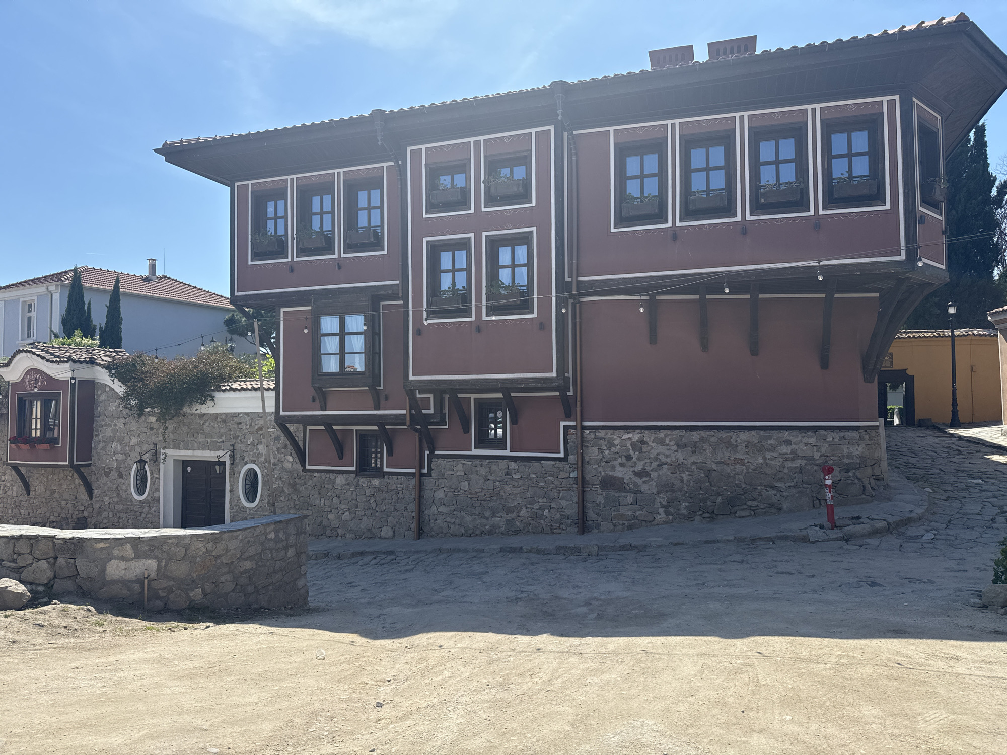 traditional Bulgarian house in the Old Town of Plovdiv, Bulgaria. The house has a stone foundation and a red-painted upper story with white trim around the windows. The windows are black and contain visible plants. The roof overhangs the upper story. To the left is a one-story stone building with a white-trimmed arched window and a dark door. In the foreground is a dirt and stone plaza. To the right, the road leads uphill towards a yellow building. A red fire hydrant is visible beside the road. A light blue building is partially visible in the background on the left. The sky is blue.
