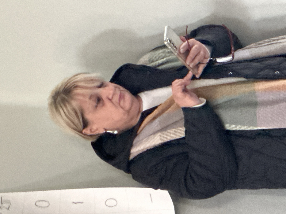 A woman with short blonde hair is holding a cell phone in her right hand, with her left hand raised. She is wearing a black coat and a scarf with tan, white, and purple colors. A pair of eyeglasses is perched near her hands. She is also wearing silver earrings. A partially visible piece of paper with handwritten numbers on it is at the bottom left of the image. The background appears to be a plain wall.