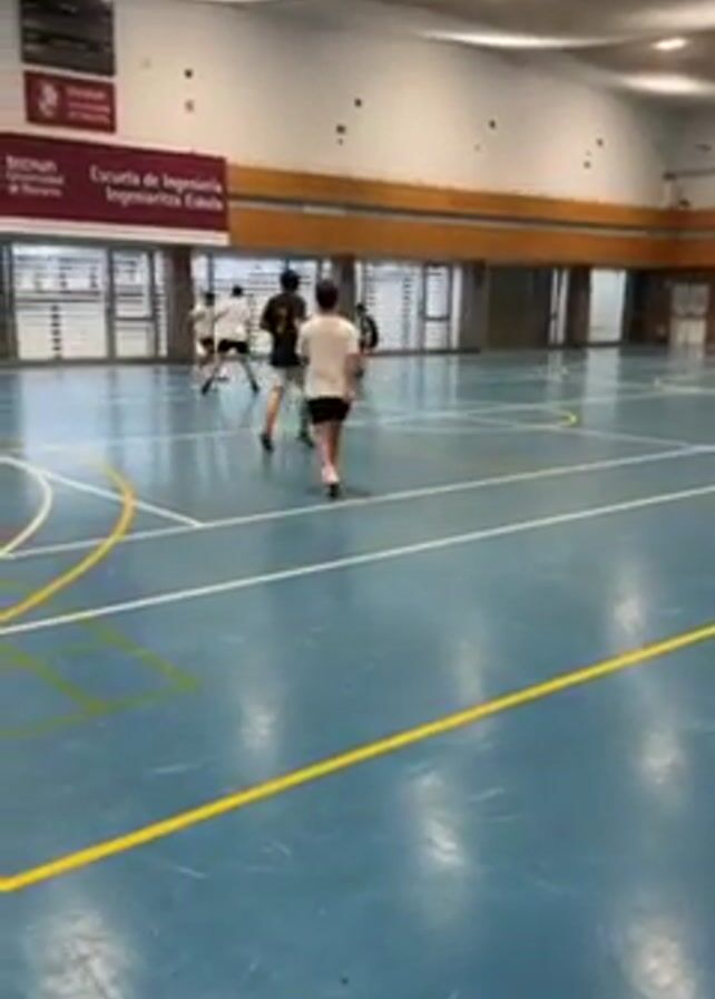 group of people playing soccer indoors in a gymnasium. The gym has a light blue floor marked with yellow lines. There is a sign in the background that reads "Escuela de Ingenieria Ingeniaritza Eskola." Several young men are actively involved in the game, passing a soccer ball back and forth. They are wearing casual athletic attire, including shorts and t-shirts in various colors. There are other players visible in the background.