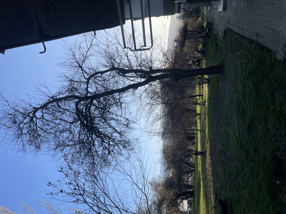The image depicts a sunlit outdoor scene within a green space in Sofia, Bulgaria, characterized by a clear blue sky. The foreground consists of a grassy area, partially shaded, with several small, dark low-lying objects embedded in the ground, possibly rocks or old stumps. A prominent, tall deciduous tree with bare branches stands slightly right of the center, silhouetted against the bright sky, its trunk rooted in the grassy expanse. The middle ground features an extensive array of bare deciduous trees and dense bushes, forming a park-like environment. Towards the right side of the middle ground, a wooden gazebo with a thatched or natural material roof is visible, accompanied by what appear to be benches or small tables nearby. In the far background, undulating hills or mountains are discernible against the clear horizon. On the far right, a segment of a multi-story building, likely residential, is visible, featuring a concrete or rendered facade. A partial view of a balcony or exterior structure is present, including a metallic railing and a distinct curved metal pipe or hook attached to the building's exterior. A paved pathway, constructed from bricks or pavers, runs along the base of the building, extending into the background. No individuals, explicit actions, or interactions are observed within the scene.