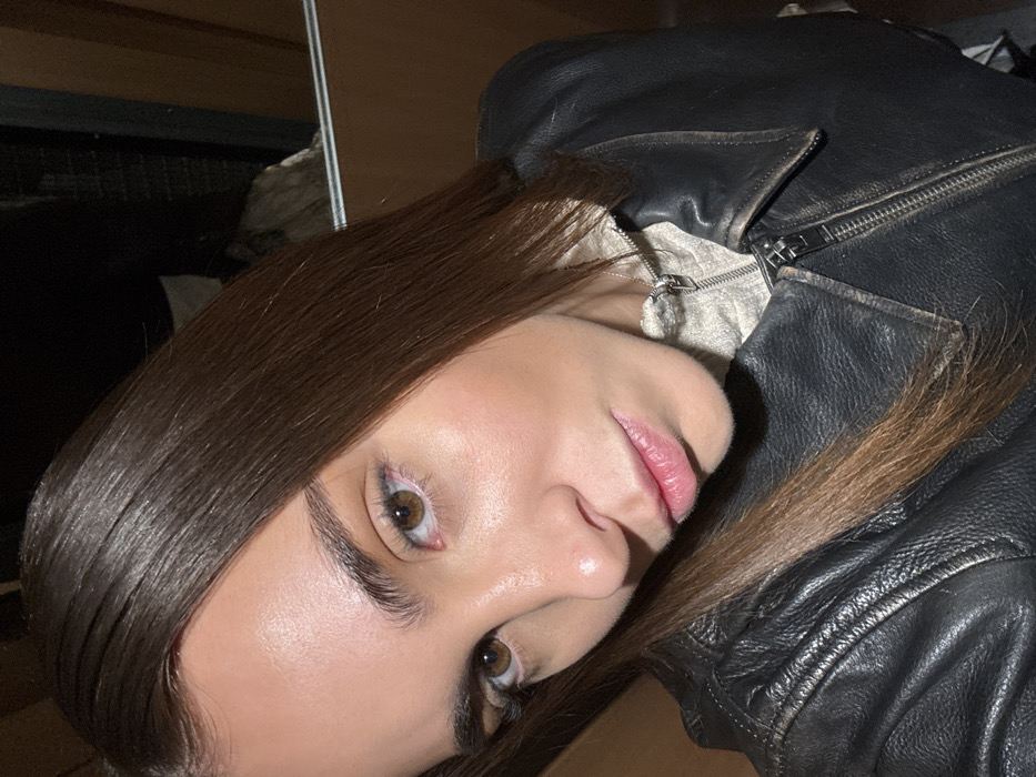The image presents a close-up, chest-up portrait of an adult female in an indoor setting within Paris, France. The subject possesses long, straight, dark brown hair, fair skin, and light brown eyes, looking directly into the camera with a neutral expression. She is attired in a dark, visibly distressed leather jacket layered over a light, possibly off-white or cream, textured top with a visible zipper. The background features warm brown paneling or a wall, and to the right, a vertical reflective surface, likely a mirror, shows indistinct, dark reflections. The scene is illuminated by artificial lighting, which highlights the subject's face.
