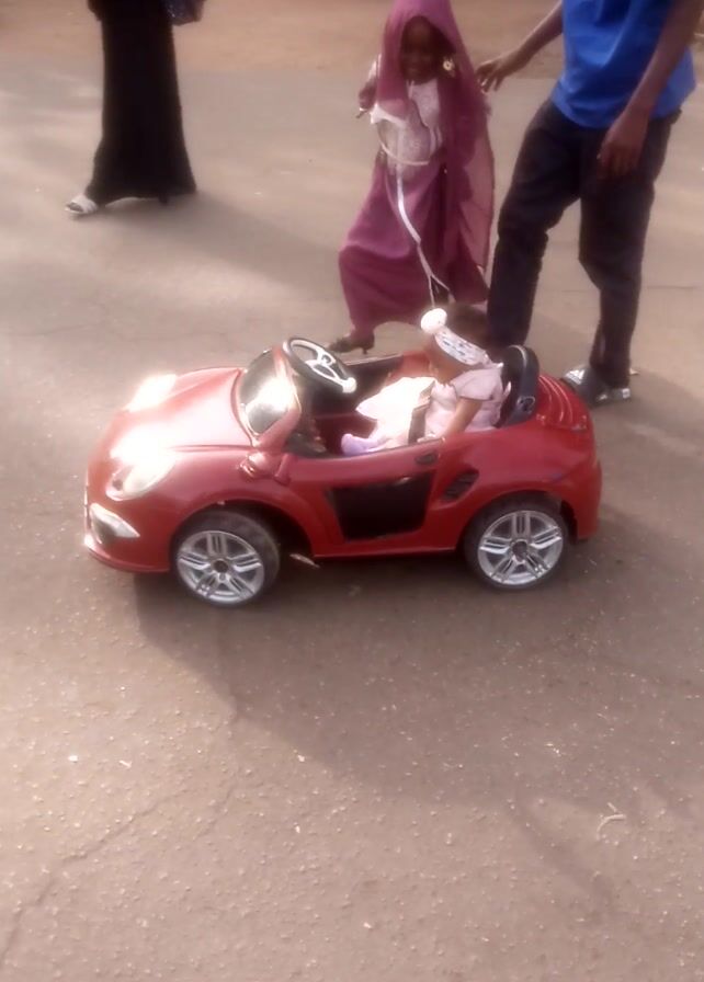 young child in a red toy car being pushed along an asphalt road. A young man in a blue shirt and black pants pushes the car, while a woman in a pink hijab and a long dress walks alongside it. Other people are visible in the background, including a person sitting on a motorcycle. The lighting suggests it's daytime and the sun is shining, creating shadows.