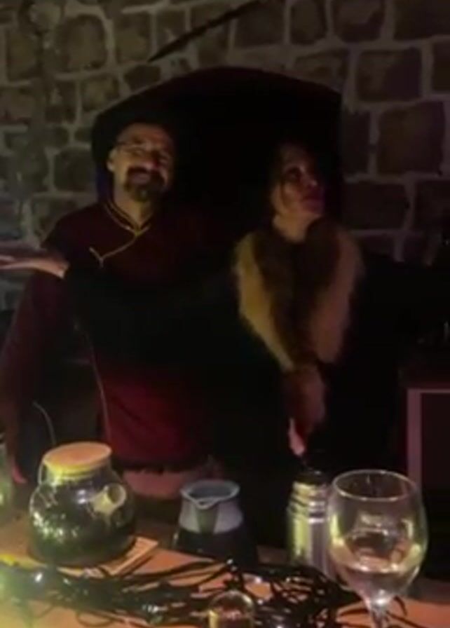 Two people are standing behind a bar, smiling and dancing to the music. The man is wearing a red jacket with gold trim and a wide-brimmed hat. The woman is wearing a black coat with a fur collar. On the bar, there are several glass jars, bottles, and glasses. The background is a stone wall. String lights are also visible on the counter.