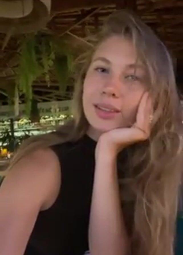 A young woman with long, light brown hair sits at a table, resting her head on her hand and looking at the camera. She is wearing a sleeveless black top and patterned pants. The background features a rustic, open-air structure with a thatched roof. Decorations including hanging plants and a wicker lamp are visible. The setting appears to be a restaurant or outdoor dining area. The lighting is dim, contributing to a relaxed atmosphere.