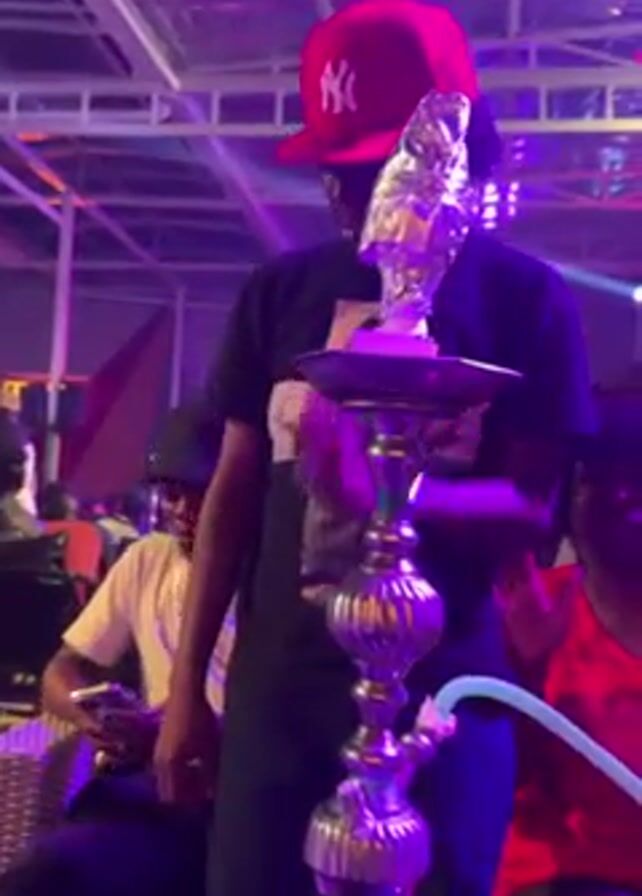person standing at a table in a nightclub, preparing a hookah. The person wears a black T-shirt, black pants, and a red NY baseball cap. They're standing in front of a tall silver-colored hookah with a light blue hose. There are other people seated at nearby tables, and the environment has club lighting with purple and blue hues. The music in the background suggests it’s a festive or party-like atmosphere. The hookah is covered with foil on top, presumably to hold the tobacco or other smoking material.