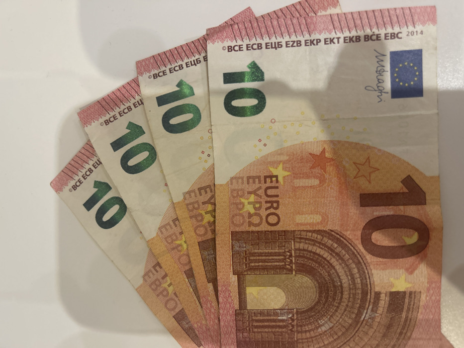 - "The image displays five 10 Euro banknotes arranged in an overlapping fan formation on a uniform white surface" by FM-F09T23, licensed under CC BY 4.0