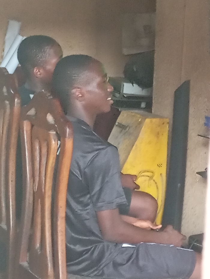 Two young black males sit in wooden chairs, engrossed in a video game displayed on a vertical screen. The foreground figure wears a shiny, dark gray athletic shirt and shorts. A second figure is partially visible behind him. The room appears cluttered, with various items in the background, including a yellow object and possibly a computer. The setting is casual and informal.