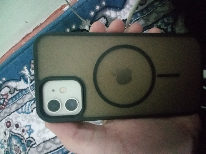 A human hand holds an iPhone vertically in an indoor setting in Fergana City, Uzbekistan. The iPhone is encased in a translucent, dark-tinted MagSafe-compatible case. The phone's rear features a dual-lens camera system and a flash at the top left corner. The Apple logo is visible through the case, centered within a circular MagSafe outline. A white cable is connected to the device's charging port at the bottom. The background consists of a light-colored patterned rug with blue and grey motifs, partially obscured by a darker blue and red textile surface on the right.