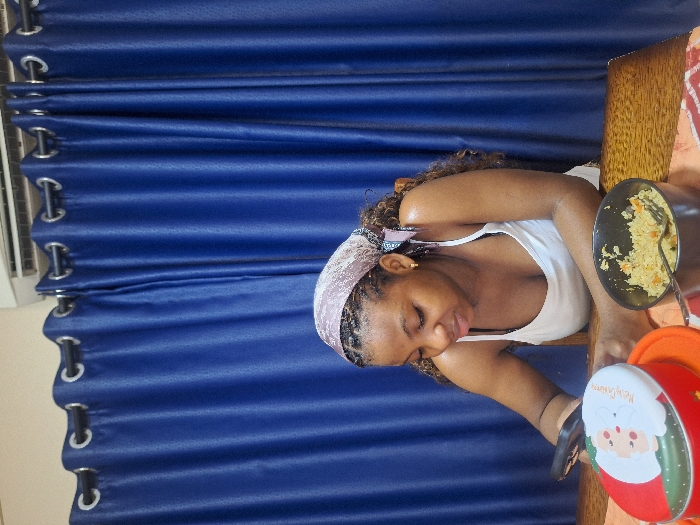 A woman with a patterned headscarf sits at a wooden table. She wears a white tank top. On the table is a plate of food with a fork and an orange container topped with a round, festive tin. She is eating in front of a dark blue curtain.