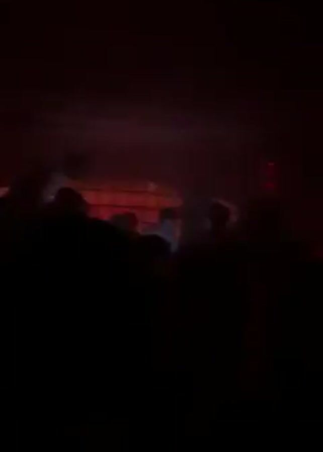 crowd of people dancing in a room bathed in red light. The people are silhouetted, making it difficult to discern specific features. The room has a textured ceiling. Intermittently, the red light is replaced by a bright white light. In one instance, an arm is raised in the air. The lighting effects and the crowd indicate that the setting is likely a club or party.