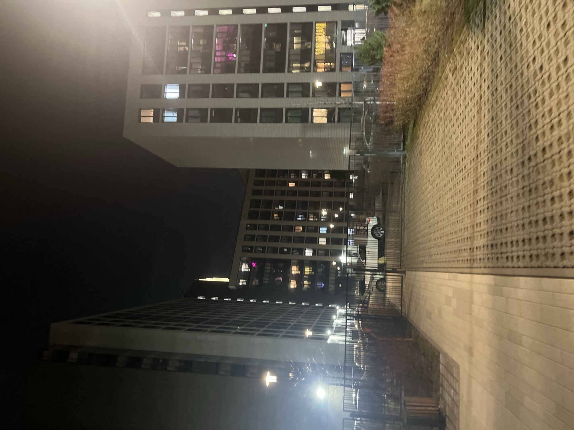 Here is a detailed description of the image: The image shows a nighttime urban scene in what appears to be Saint Petersburg, Russia. The primary subjects are several tall, modern apartment buildings, likely constructed during the Soviet era due to their style. These buildings are well-lit, with windows showing varied light sources, indicating residential activity. Adjacent to the buildings is a paved area, possibly a pedestrian walkway, with a distinctive pattern of evenly spaced square perforations in the surface. A low barrier or fence separates the walkway from the apartment buildings. In the background, cars are parked alongside the buildings. The overall environment is urban, with the light pollution typical of a city at night. No people are visible in the immediate scene. The angle of the photograph suggests it was taken from a low vantage point, potentially street level. The lighting is consistent with standard streetlights or building-mounted illumination.