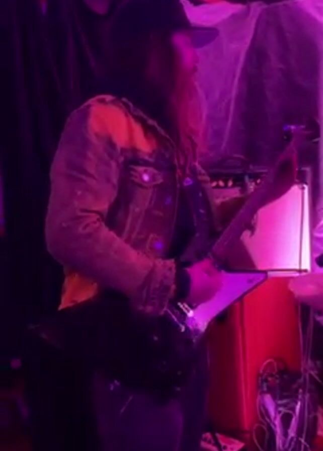 A man with long hair and a beard is playing an electric guitar. He's wearing a black baseball cap, a denim jacket with orange accents, and jeans. He is standing in front of a drum set and an amplifier, bathed in purple light. The background includes dark curtains, a cobweb decoration, and various wires and equipment. The man is focused on playing the guitar.