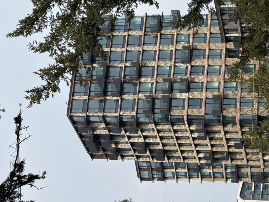A modern, multi-story residential building located within Garitage Park, Mladost 4, Sofia, Bulgaria, is prominently featured under an overcast sky. The building's facade is constructed from light-toned bricks arranged in a distinctive herringbone pattern, interspersed with numerous large, dark-framed rectangular windows. Integrated into the facade are multiple dark-colored, recessed balconies, each equipped with minimalist metal railings, which appear to alternate positions vertically across floors. Thin, reddish-brown horizontal bands delineate each floor level. The building exhibits a stepped architectural profile with multiple blocks. In the foreground, dark green conifer branches partially obscure the upper and right portions of the structure. A faint, light-colored skeletal structure, consistent with a construction crane, is visible against the sky in the upper left quadrant. A segment of another contemporary building featuring a curved, light-colored facade is visible in the lower left corner. No individuals are discernible.