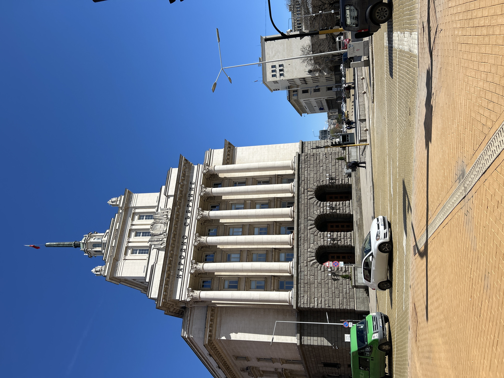 Largo in Sofia, Bulgaria, featuring the architectural ensemble of Socialist Classicism style buildings. The sky is clear blue. The main subject is a large, ornate building with a tower and a red flag on top. The building has multiple floors with columns. The exterior is made of light-colored stone and darker stone. In front of the building is a pedestrian area paved with yellow brick. A white car is parked along the curb, and a green utility van is parked in front of it. The shadow of a street light pole is visible on the pavement. Other buildings are visible in the background, along with a street with parked cars and pedestrians.