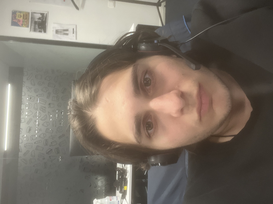 A young adult male, with medium-length dark brown hair parted down the middle, light stubble, and brown eyes, is depicted in a head-and-shoulders shot