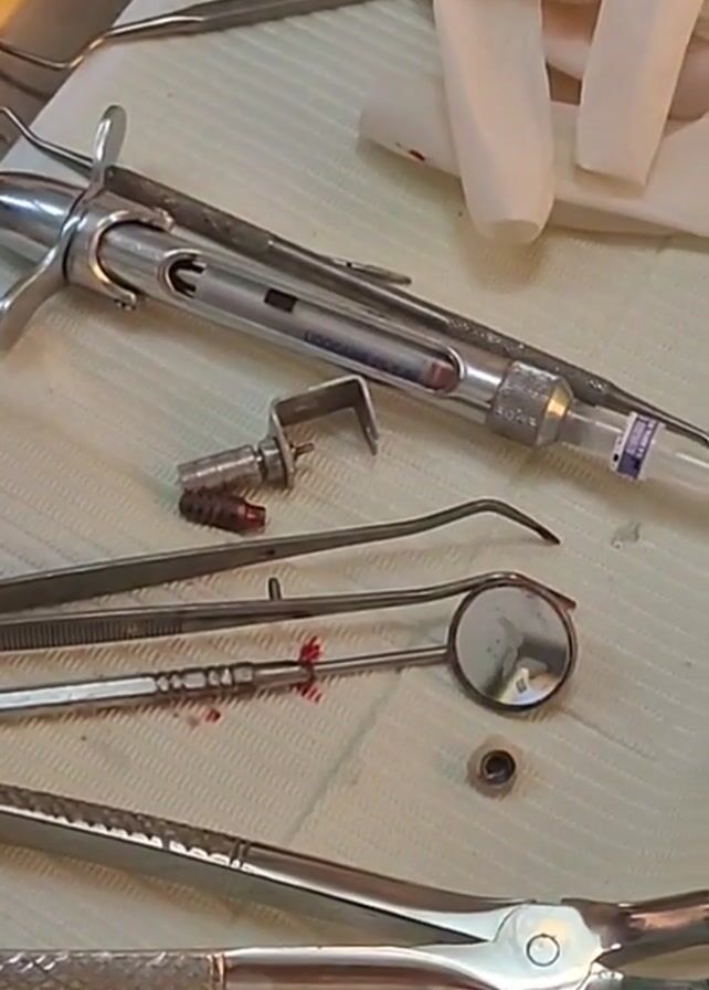 close-up view of dental instruments and supplies laid out on a light-colored, patterned surface, likely in a dental office or clinic. The main instruments visible include a dental syringe, forceps, tweezers, a dental mirror, and various probes. Some of the instruments have traces of blood on them. A pair of disposable gloves sits next to the instruments. The camera angle focuses on the tools and the immediate area around them, providing a clear, detailed view of the scene.
