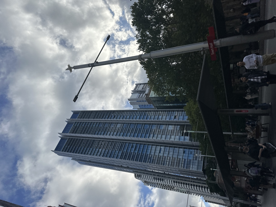 Captured from a low angle, a tall, modern skyscraper dominates the frame, its mirrored glass reflecting the cloudy sky. A street sign reading "Town Hall" is visible near a crowd of people. A decorative streetlamp with a star-shaped ornament extends into the sky. Trees intermingle with the urban landscape, adding a touch of nature to the architectural scene.