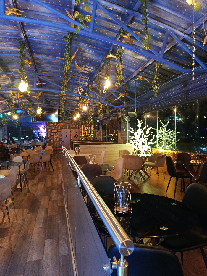 An indoor restaurant scene shows a modern design with wooden floors and a blue-toned ceiling adorned with hanging vines and bird ornaments