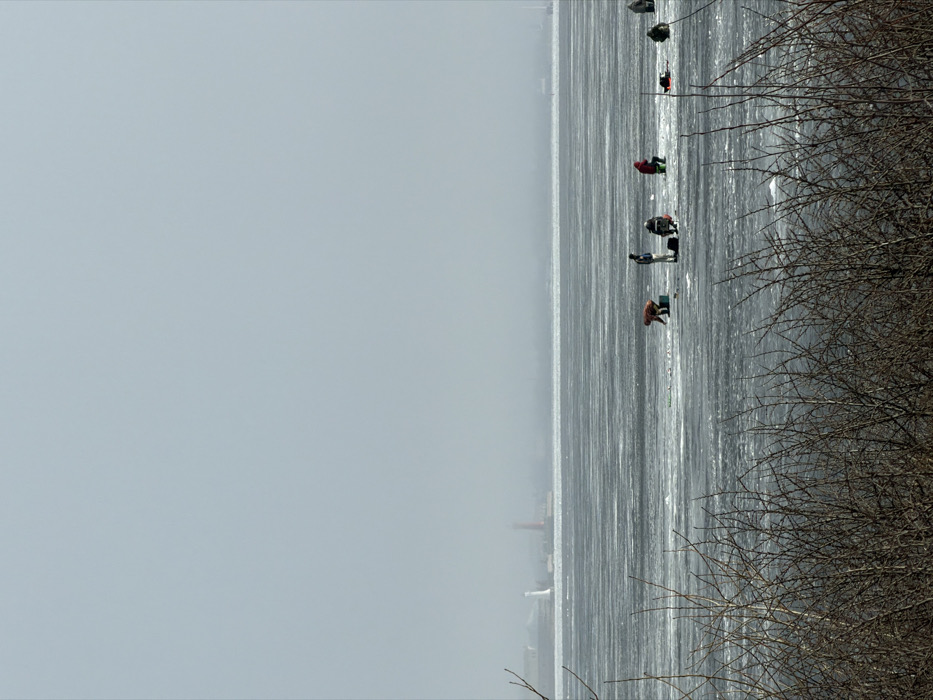 The image displays an expansive view of a frozen body of water, identified as the Gulf of Finland near Kronstadt, Russia, under an overcast, light gray sky. In the distant background, a faint coastline features two distinct structures: a prominent white lighthouse to the left and a reddish-brown navigational beacon further to the right. At least seven individuals are distributed across the midground on the frozen surface, engaged in ice fishing. From left to right: one person in an orange jacket is bent over the ice; another individual stands upright; a third is seated on a dark object; a fourth, wearing a red jacket, is seated on a green object; a fifth person is positioned prone or partially reclined on a red object; a sixth is seated on a dark object; and a seventh is indistinctly visible further to the right. Various items of fishing gear, including buckets and what appear to be sleds, are present near the individuals. The ice surface shows textural variations and linear patterns, with some darker patches. The immediate foreground is occupied by a dense arrangement of out-of-focus, leafless, dark brown branches and twigs.