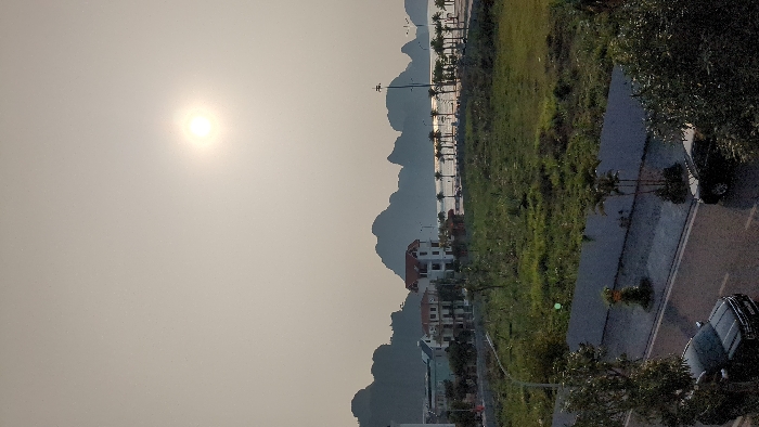 An elevated, wide-angle photograph depicts a coastal landscape in Ha Long Ward, Vietnam, under a hazy sky. The upper two-thirds of the image is dominated by a pale, yellowish-grey sky with a bright, diffused sun positioned in the upper right quadrant. On the distant horizon, a series of dark, silhouetted limestone karst formations are visible, characteristic of Ha Long Bay. Immediately in front of these formations, a body of water shimmers, reflecting the sunlight. Along the water's edge, a linear arrangement of numerous palm trees lines what appears to be a coastal road or promenade. Several multi-story buildings, primarily white with red-tiled roofs, are situated near the coastline, interspersed with greenery. Below this urban strip, a large expanse of green, undeveloped land with sparse vegetation occupies the mid-ground. In the immediate foreground, a dark asphalt road, appearing wet, traverses the scene horizontally. A white dashed line is visible on the road. Two dark-colored vehicles are present on the road: a dark SUV on the left and a dark sedan on the right. Green trees and dense foliage line the edges of the road, partially obscuring the vehicles. A low, light-grey concrete wall separates the road from the undeveloped field. No people are visible.