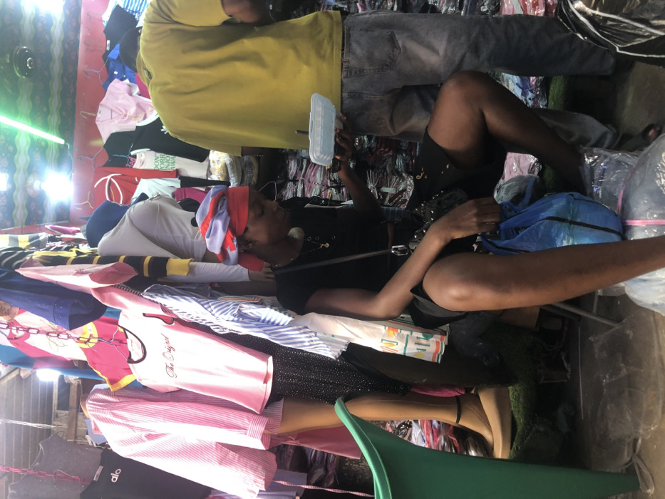 The scene depicts an interior view of a clothing market stall or shop located in Fegge, Nigeria