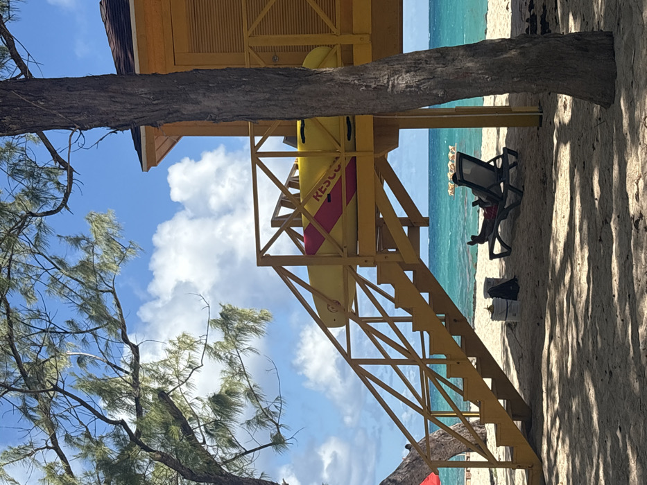 This image captures a beach scene in Wellhouse, Barbados, under a clear sky with scattered white cumulus clouds. In the midground, a two-story yellow lifeguard station stands on the sandy beach. The station features a brown shingled roof and an enclosed upper level with louvered panels. A yellow wooden staircase with railings ascends to a landing on the first level. A yellow rescue paddleboard, marked with "RESCUE" in red capital letters and a diagonal red stripe, is stored horizontally on this landing. To the left of the station, partially obscured by a tree, a red umbrella is visible on the sand. Directly beneath the staircase, a single person lies reclined on a dark beach lounge chair, facing the ocean. The individual wears red shorts and is actively engaging with a mobile device held in their hands, with their feet elevated on the chair. To the left of the chair, two white buckets and a dark bag rest on the sand. The foreground is dominated by light-colored sand, marked with dappled shadows from several trees, likely casuarinas, whose trunks and needle-like branches are visible on the left and right sides of the frame. Beyond the beach and the lifeguard station, the turquoise-blue ocean stretches to the horizon, with small waves visible in the distance. A small, flat, rectangular object floats on the water's surface further out.