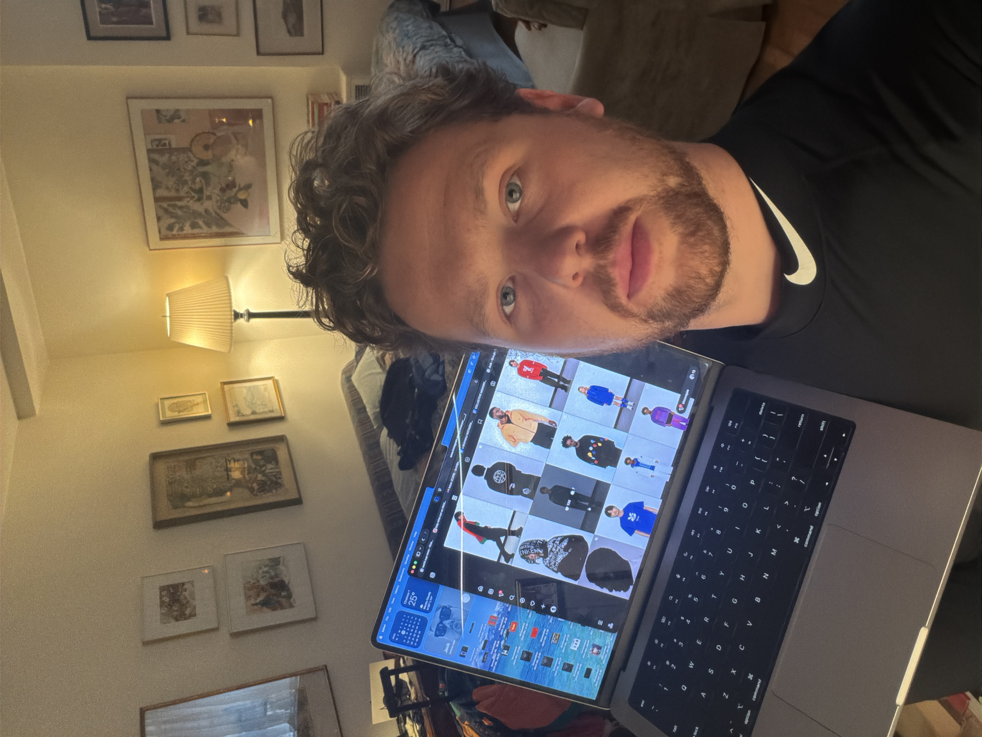 man with curly hair and a beard, wearing a black Nike shirt. He is holding a laptop with a website open displaying various clothing items. The laptop is a gray MacBook. The background reveals a wall adorned with several framed pictures and a lamp, suggesting an indoor environment. Based on the content on the screen, it's likely the man is browsing or working on something related to fashion or e-commerce. It is difficult to determine the location.