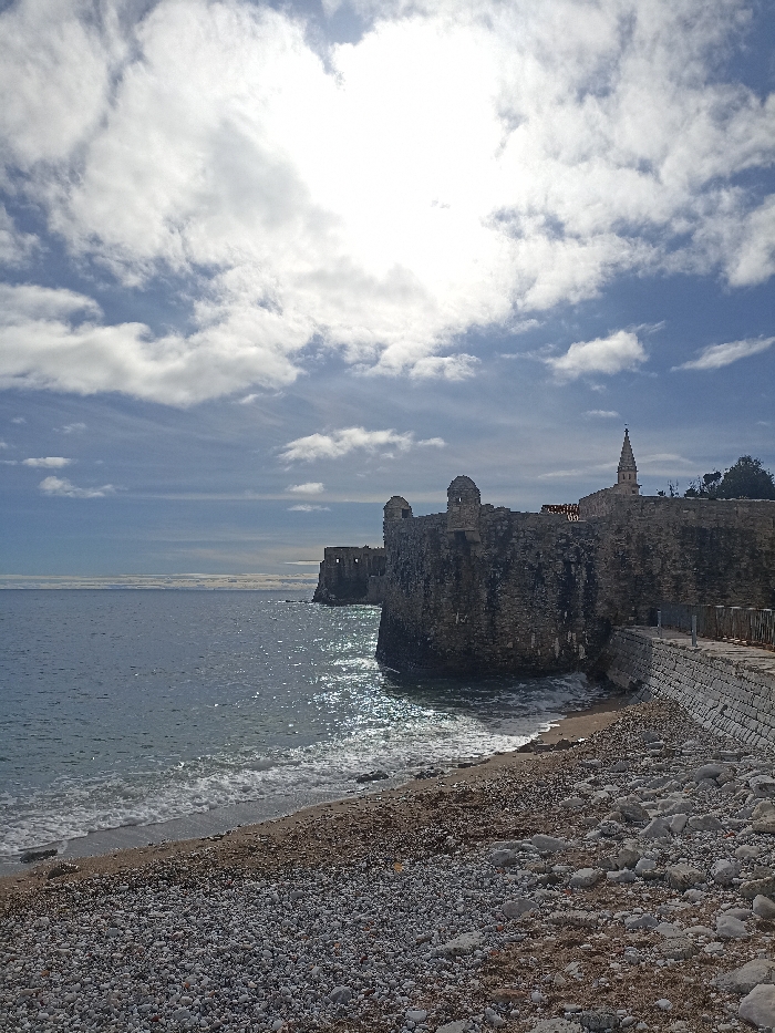 The image displays a coastal scene in Budva, Montenegro, centered on the historic Old Town fortifications. The foreground is occupied by a pebble beach composed of various grey and white stones, meeting the Adriatic Sea. Small, white-capped waves break gently along the shoreline. To the right, prominent dark stone fortifications, identified as sections of the city's ancient walls, rise directly from the water and the narrow beach. These walls feature at least two round stone turrets or bastions projecting towards the sea. Behind the main section of the wall on the right, a distinct, slender church spire, light in color and topped with a finial, is visible. A paved stone walkway, bordered by a low retaining wall and metal posts with horizontal railings, runs along the base of the fortifications, slightly elevated above the beach. The sea surface in the midground reflects intense sunlight, creating a shimmering effect, and extends to a flat, hazy horizon line. The sky above is partly cloudy, with bright sunlight emanating from a clear area amidst scattered white cumulus clouds. No individuals are present in the frame.