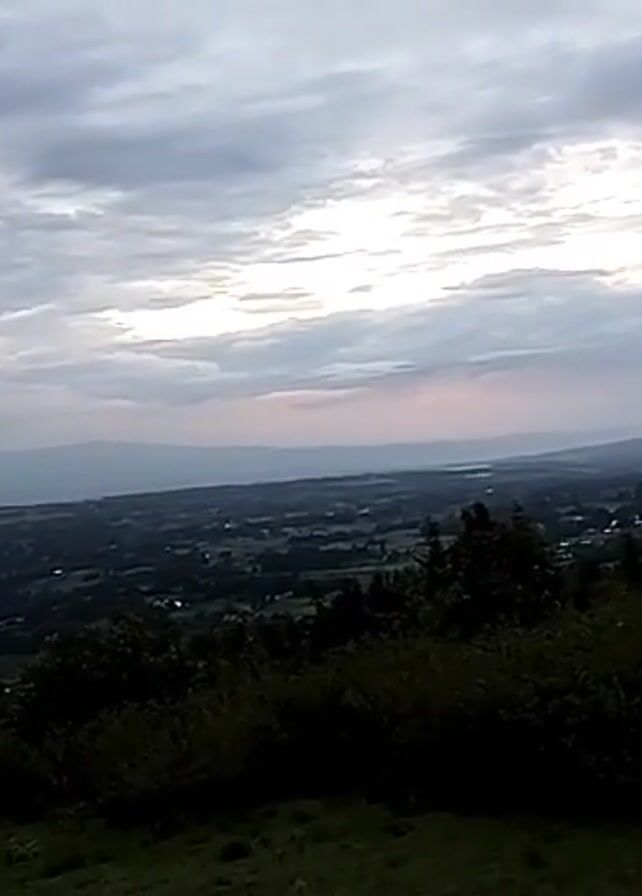landscape from a slightly elevated position, looking out over a large valley or plain. The sky is overcast with thick clouds, allowing only a faint, diffused light to filter through. In the distance, a body of water, possibly a lake or bay, is visible against the horizon. The land below is a mix of green fields, scattered trees, and what appear to be small buildings, suggesting a rural or agricultural area. The foreground is dominated by vegetation, including bushes and grass, blurring the view slightly. The camera is steady, capturing a wide, still shot of the scenery. Voices can be heard, indicating the presence of people nearby.