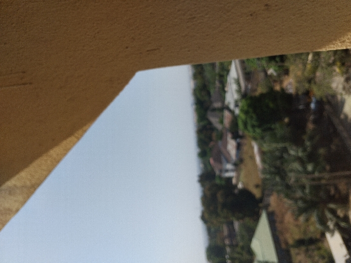 An elevated view shows treetops, rooftops, and a light blue sky. The architecture appears residential, nestled among greenery. A beige, textured surface, possibly part of a building structure, frames the upper-left portion of the image. The perspective suggests looking out from a high vantage point, like a balcony.