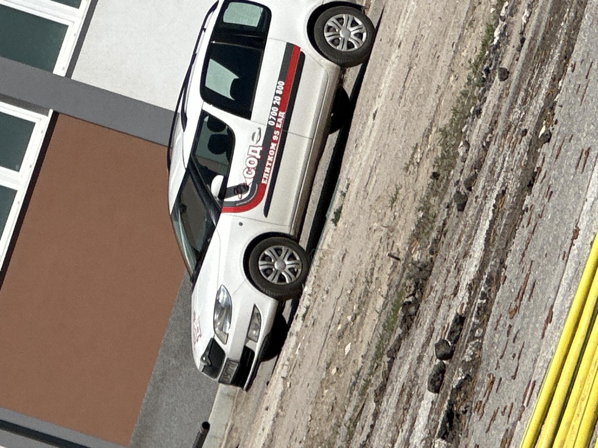 A white van with the words "СОД ЕЛИТКОМ 95 ЕАД" and the phone number "0700 20 800" is parked on a paved surface next to a building in Sofia, Bulgaria. The building has brown and grey walls and white-framed windows. The van is positioned at an angle, facing the viewer. The surrounding area is dusty and slightly littered. Yellow pipes are visible on the right edge of the frame.